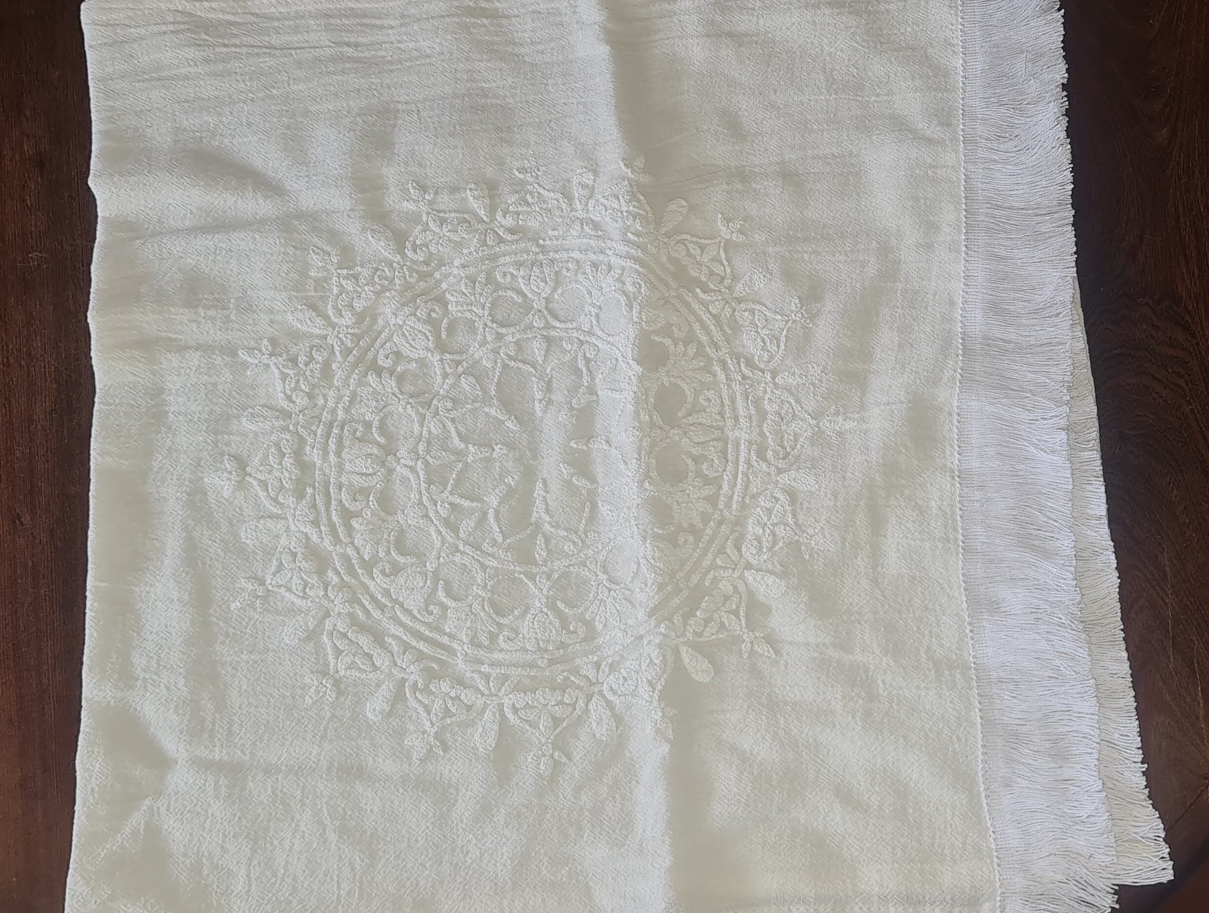 Aplique pintura con relieve ( siempre es color blanco ) y flecos muy finos por cada uno de los dos extremos
