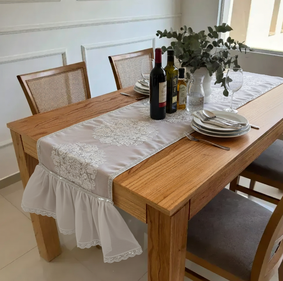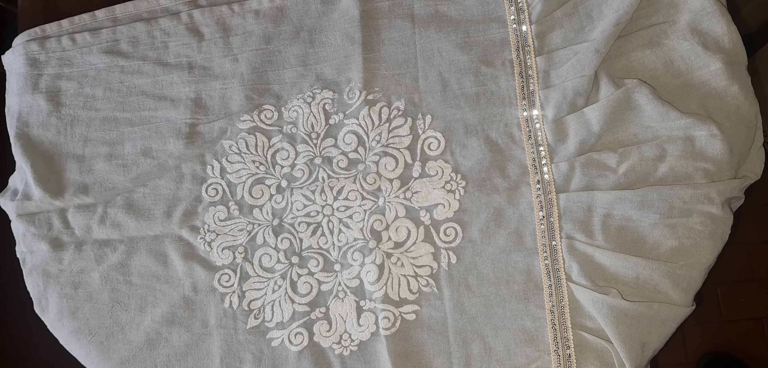 Aplique pintura con relieve ( siempre es color blanco ) y ribete de guarda en lentejuelas plateadas con bolado bombe