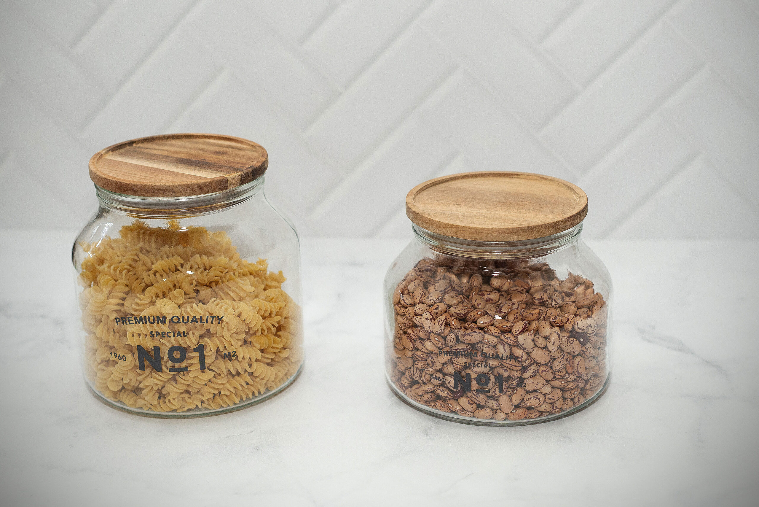 Frasco redondo de vidrio acanalado con tapa de madera acacia.