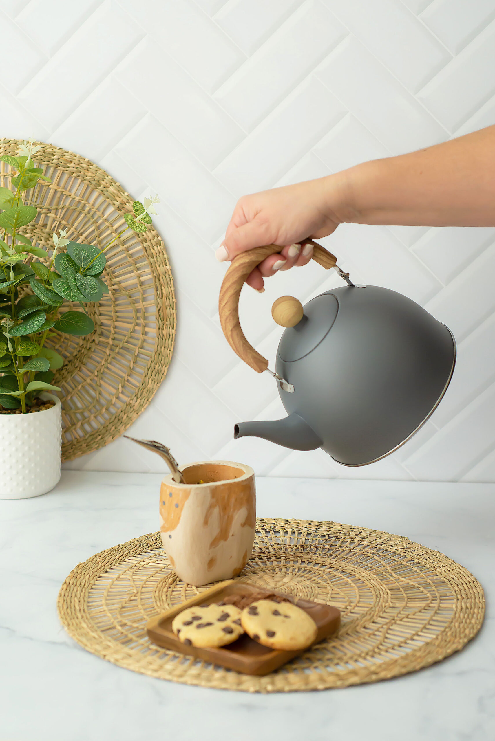 Pava de acero inoxidable gris, acabado mate con mango simil madera soft touch y pico cebador.