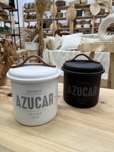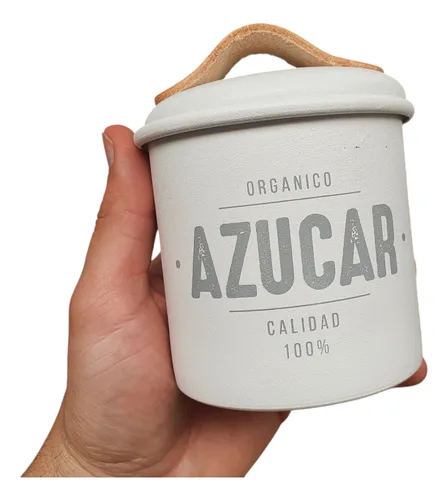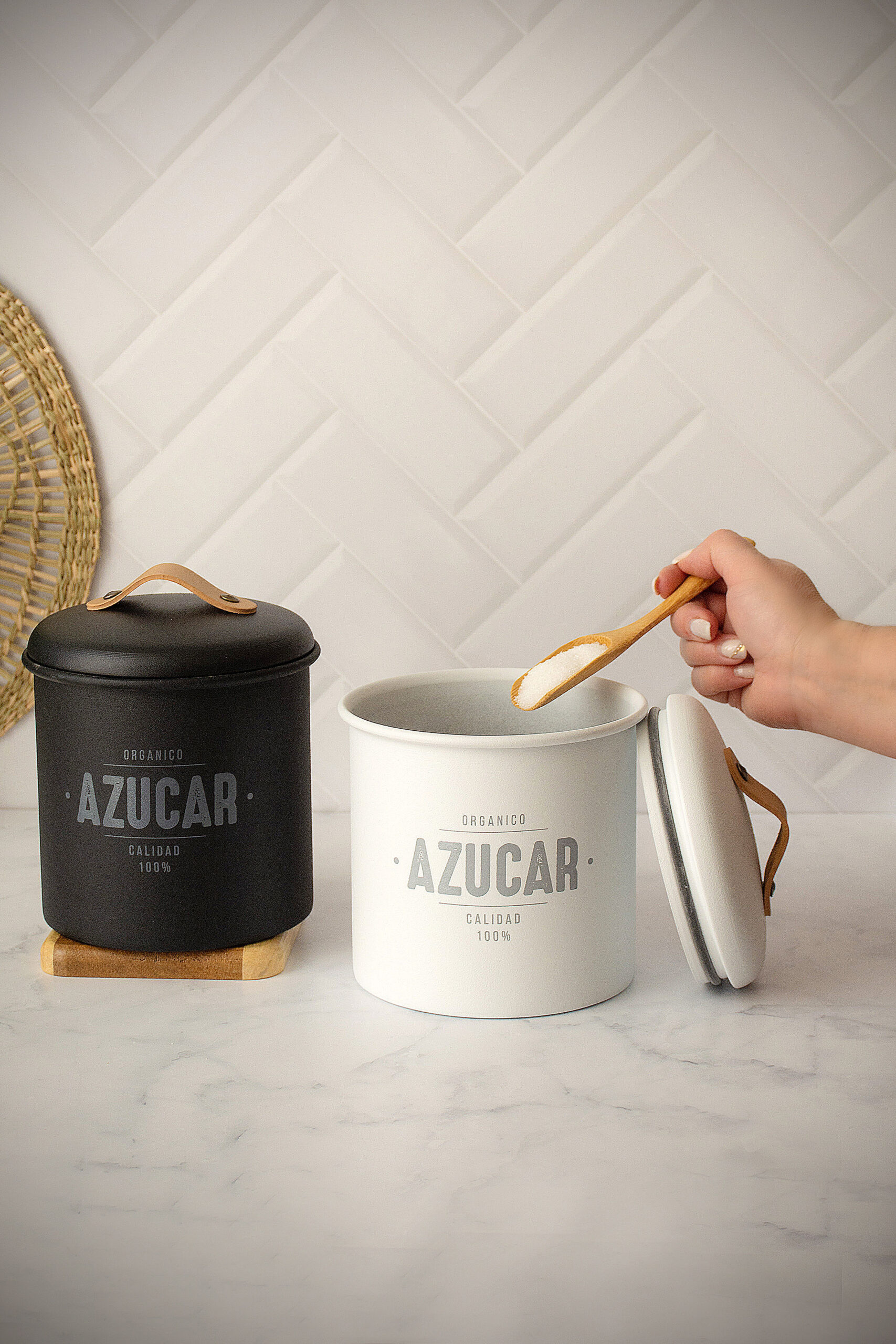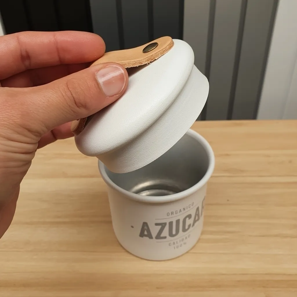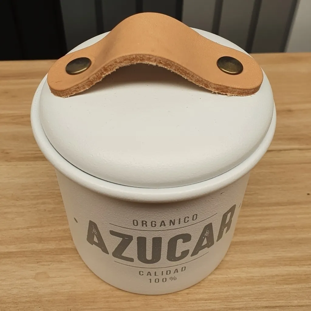 Tarro lata de azucar de aluminio hermetico con manija de cuero